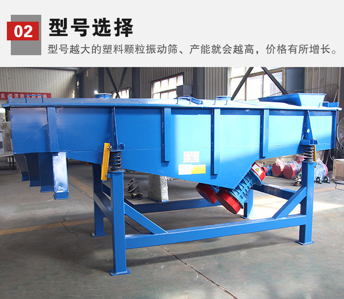 2、型號選擇:各種塑料顆粒振動篩型號多樣,型號越大的塑料顆粒振動篩、產(chǎn)能就會越高,相應(yīng)的價格也會有所增長。
