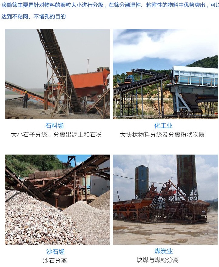 滾筒篩由一個穿孔的圓柱形滾筒組成,該滾筒通常在進料端以一定角度升高,當進料沿旋轉滾筒螺旋向下時實現(xiàn)物理尺寸分離,其中小于篩孔的尺寸過小的材料通過篩網,而尺寸過大的材料從滾筒的另一端排出,用于粘性和纖維材料的分類,例如在煤炭或天然石材工業(yè)中。