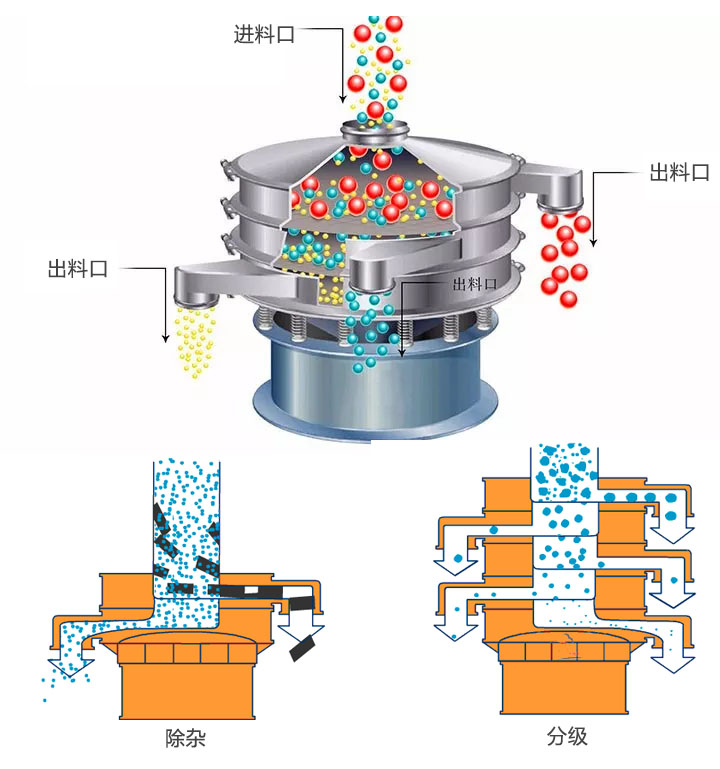 將速凍玉米倒入篩機(jī)中,在振動(dòng)電機(jī)的作用下,速凍玉米在篩面上由中間向四周擴(kuò)散,期間,速凍玉米根據(jù)粒度通過篩網(wǎng),大于篩網(wǎng)尺寸的速凍玉米將停留在篩面上并從出料口排出,小于篩孔的速凍玉米將進(jìn)入下層篩網(wǎng)繼續(xù)篩分,直至被排出。